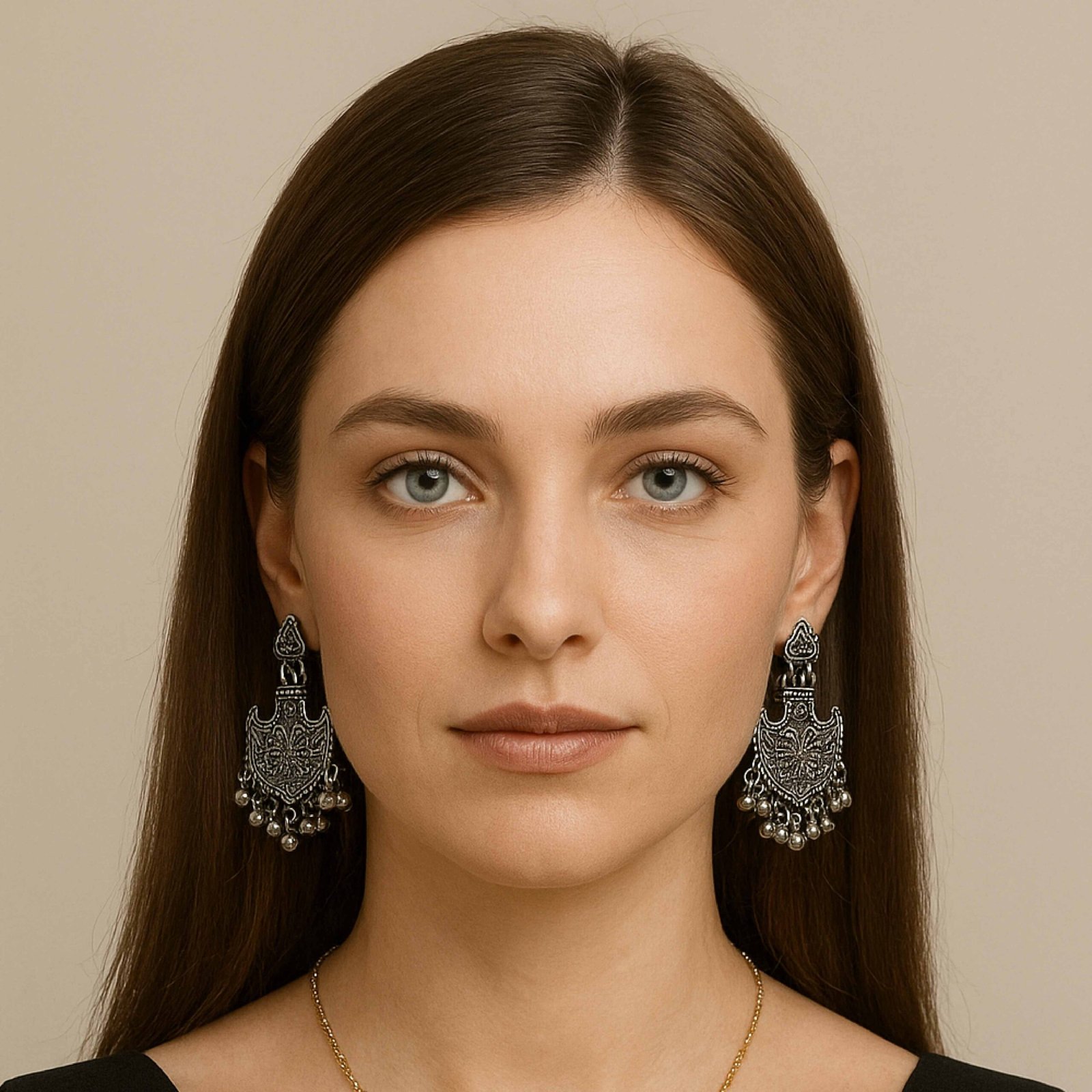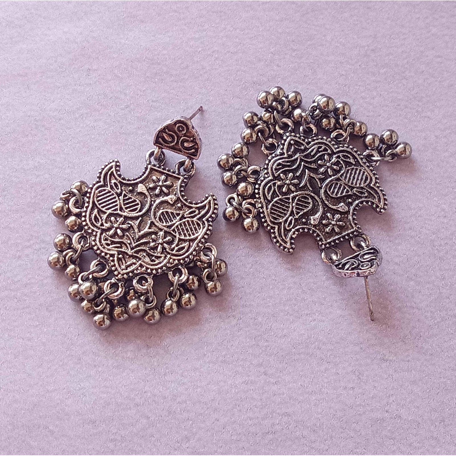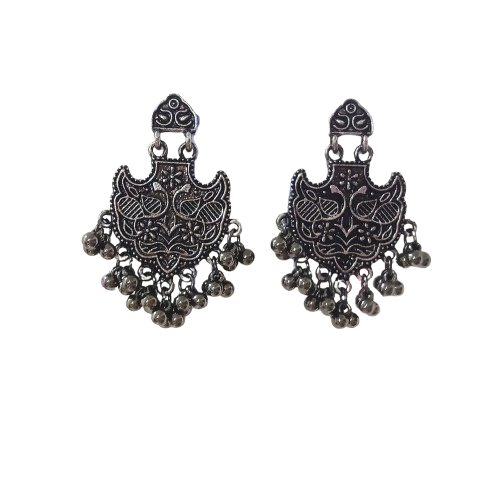 These intricately carved oxidised earrings feature fine detailing and cascading ghungroo drops, giving them a rich handcrafted charm. Perfect for festive evenings and elegant ethnic looks, they add a bold yet timeless statement to any outfit.