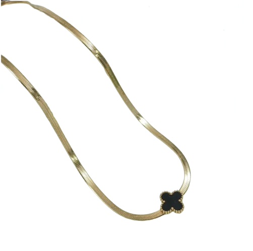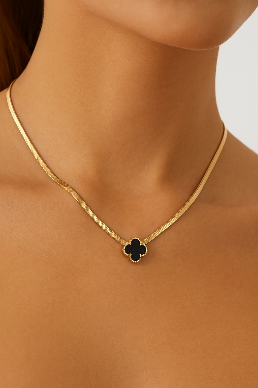 Western Style Black Clover Pendant Necklace with Gold Plated Sleek Snake Chain, 45cm Nature Theme Fashion Statement Jewellery for Women
