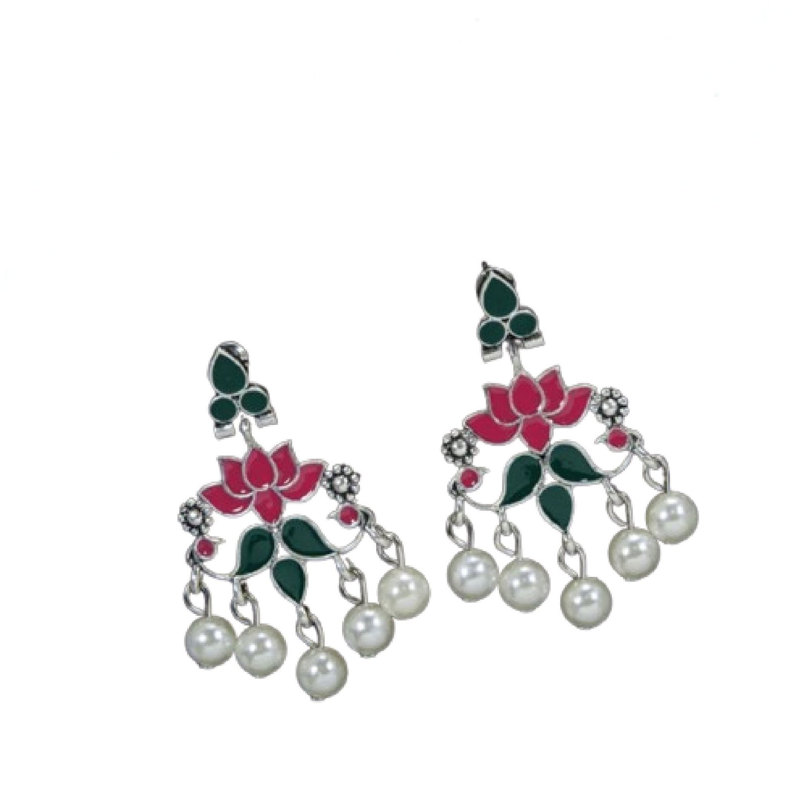 Elegant Floral Drop Earrings with Pink Lotus Design, Green Enamel Leaves, Pearl Danglers, Antique Silver Finish