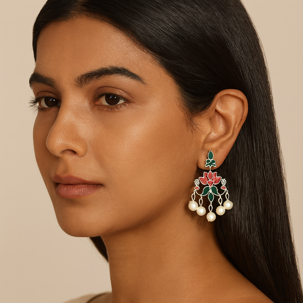 Style Your Pink Green Lotus Antique Dangling Pearl Earring with a flowy pastel lehenga or an elegant organza saree, soft rosy makeup with defined eyes, silver heels, a delicate bracelet, and a sleek potli or clutch for a graceful festive look.