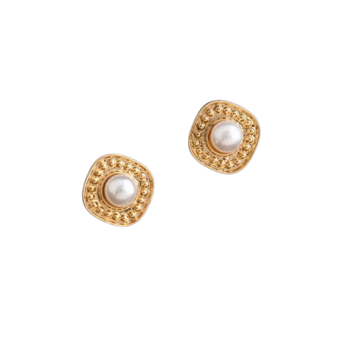 Royal Pearl Stud Earrings, Gold Plated with Decorative Frame, Round Shape, Fashion Jewelry for Women