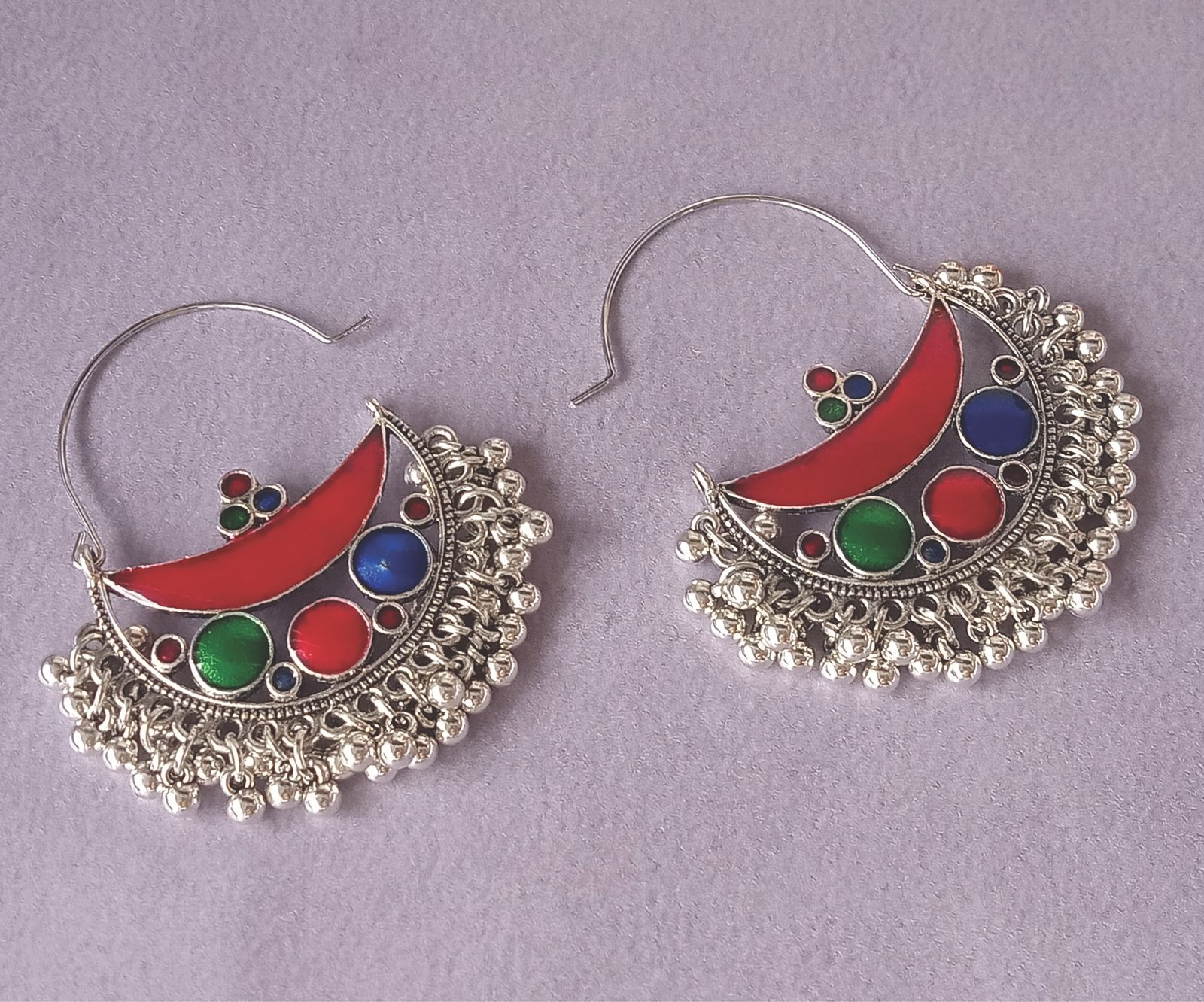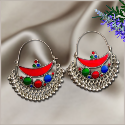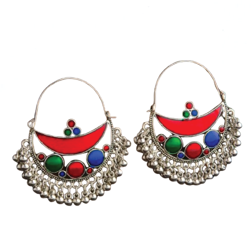 Traditional Afghan Tribal Earrings, Silver Tone Metal Chandbali with Red Blue Green Enamel Art work , Ethnic Hoop Style with Hanging Silver Beads